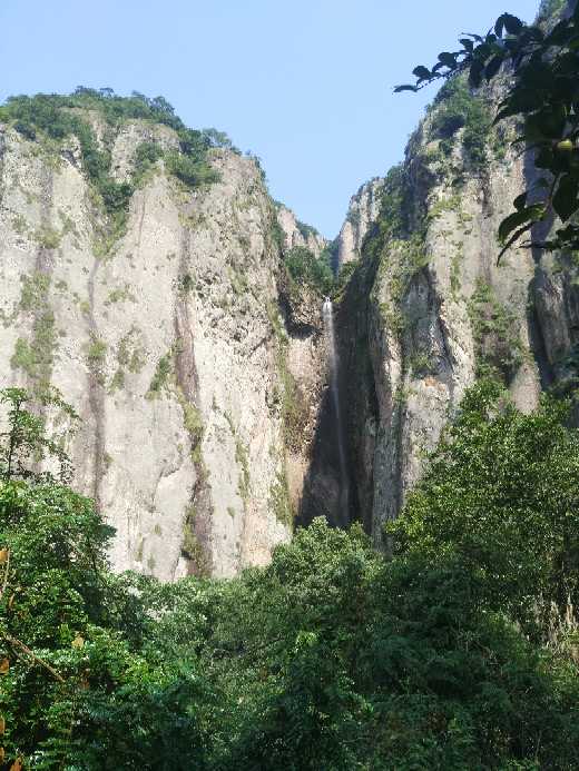 中折瀑 一条流淌在一亿年前形成的火山通道里的瀑布。瀑壁上可以见到很壮观的流纹岩,然而说好的柱状节理呢